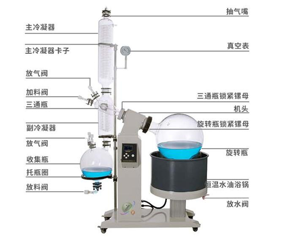 蒸餾燒瓶,但具有標準研磨口接口的梨形或圓形底燒瓶通過高度回流蛇形冷凝器管與減壓泵連接,回流冷凝器管與研磨瓶連接,用于接收蒸發(fā)的有機溶劑。在冷凝管與減壓泵之間有13通活塞,當體系與大氣相通時,可以將蒸餾燒瓶,接液燒瓶取下,轉移溶劑,當體系與減壓泵相通時,則體系應處于減壓狀態(tài)。使用時,應先減壓,再開動電動機轉動蒸餾燒瓶,結束時,應先停機,再通大氣,以防蒸餾燒瓶在轉動中脫落。作為蒸餾的熱源,常配有相應的恒溫水槽。